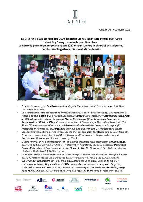 Métiers 26 novembre 2021 - 19:22 On y retrouve Guy Savoy en première position pour la cinquième année consécutive ainsi que de nombreux Chefs français comme Arnaud Donckele, Alain Passard ou encore Gilles Goujon. PDF (1 Mo) Télécharger