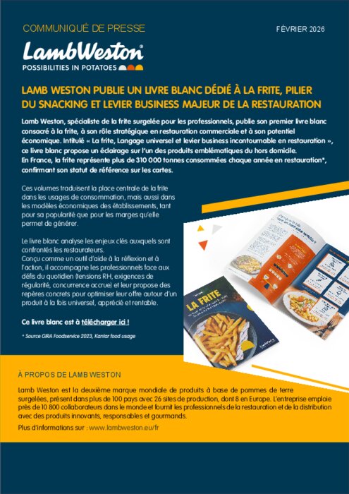 Lamb Weston, spécialiste de la frite surgelée destinée aux professionnels, dévoile son tout premier livre blanc consacré à la frite, à son rôle stratégique en restauration commerciale et à son potentiel économique. Intitulé « La frite, langage universel et levier business incontournable en restauration », cet ouvrage apporte un éclairage approfondi sur l’un des produits phares de la consommation hors domicile.