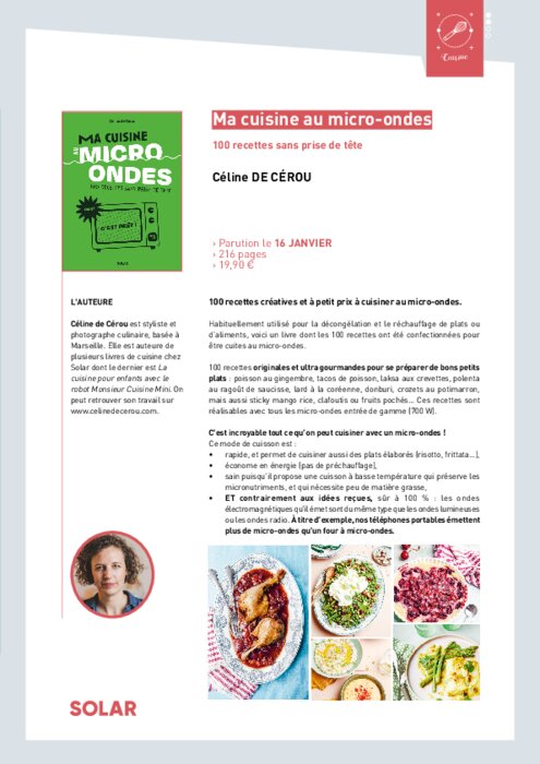 Depuis son studio de photos culinaires marseillais, la styliste et photographe Céline de Cérou a concocté ce livre de 100 recettes au micro-ondes. Des idées gourmandes et créatives qui devraient en surprendre beaucoup par l'inventivité et la qualité des résultats.