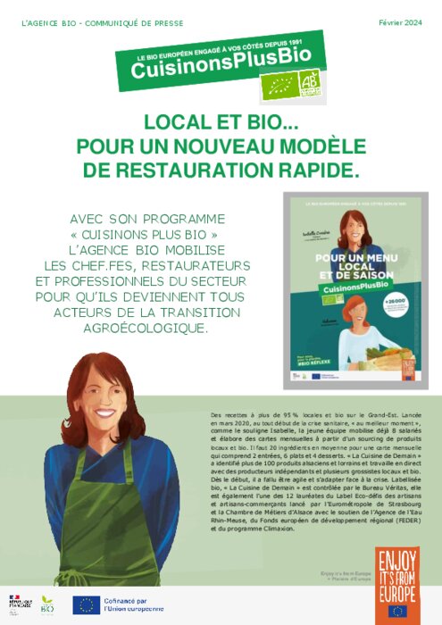 L’Agence BIO mobilise les chef.fes, restaurateurs et professionnels du secteur pour qu’ils deviennent tous acteurs de la transition agroécologique en faisant la part belle au bio dans leurs menus. En France, les 170 000 restaurants ne proposent que 1 % de bio à leur carte et les 80 000 cantines n’achètent que 7 % de leurs denrées en bio . La campagne de communication « Cuisinons Plus Bio » vise à convaincre les professionnels de la restauration de l’opportunité du marché bio, à les inciter à s’engager dans ce mouvement de fond pour la transition alimentaire et à les accompagner tout au long de leur démarche.