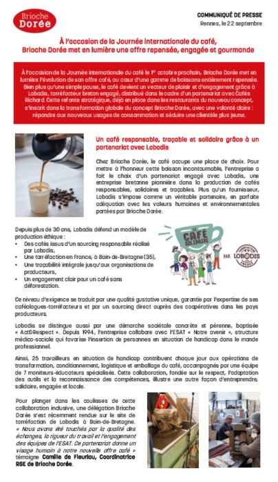 À cette occasion, Brioche Dorée met en lumière l’évolution de son offre café, au cœur d’une gamme de boissons entièrement repensée. Bien plus qu’une simple pause, le café devient un vecteur de plaisir et d’engagement grâce à Lobodis, torréfacteur breton engagé, distribué dans le cadre d’un partenariat avec Cafés Richard. Cette refonte stratégique, déjà en place dans les restaurants du nouveau concept, s’inscrit dans la transformation globale du concept Brioche Dorée, avec une volonté claire : répondre aux nouveaux usages de consommation et séduire une clientèle plus jeune.