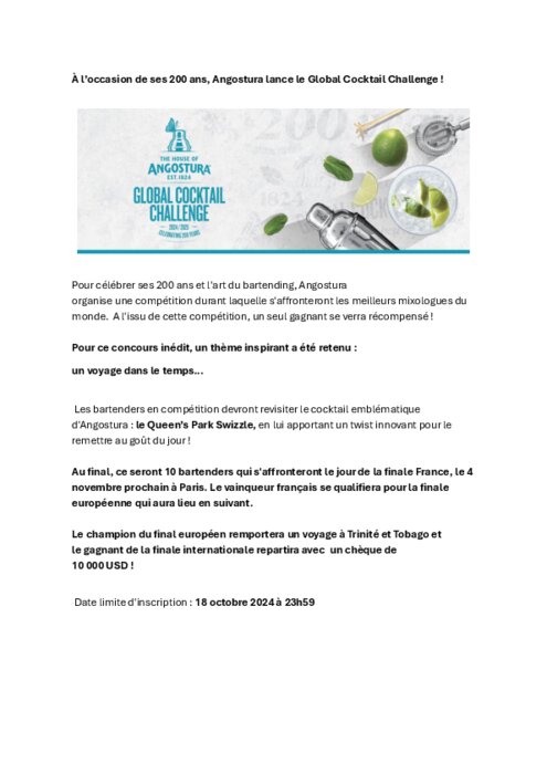 Pour célébrer ses 200 ans et l'art du bartending, Angostura organise une compétition durant laquelle s'affronteront les meilleurs mixologues du monde. A l'issu de cette compétition, un seul gagnant se verra récompensé. Pour ce concours inédit, un thème inspirant a été retenu : un voyage dans le temps.
