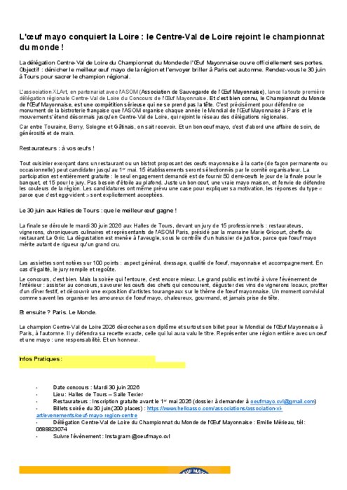 L'association XLArt, en partenariat avec l'ASOM (Association de Sauvegarde de l’Œuf Mayonnaise), lance la toute première délégation régionale Centre-Val de Loire du Concours de l'Œuf Mayonnaise. Et c’est bien connu, le Championnat du Monde de l'Œuf Mayonnaise, est une compétition sérieuse qui ne se prend pas la tête. C'est précisément pour défendre ce monument de la bistroterie française que l'ASOM organise chaque année le Mondial de l'Œuf Mayonnaise à Paris et le mouvement s'étend désormais jusqu'en Centre-Val de Loire, qui rejoint le réseau des délégations régionales.