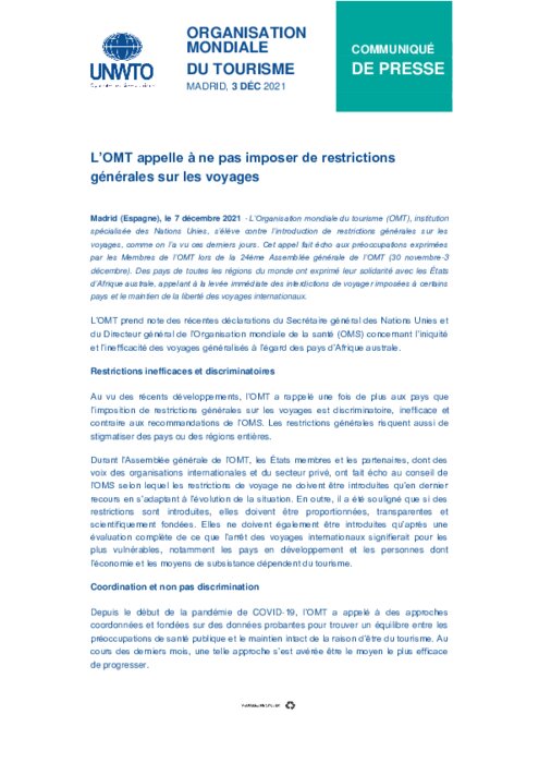 Métiers 07 décembre 2021 - 16:17 L'Organisation mondiale du tourisme (OMT), institution spécialisée des Nations Unies, s'élève contre l'introduction de restrictions générales sur les voyages, comme on l'a vu ces derniers jours. PDF (150 Ko) Télécharger