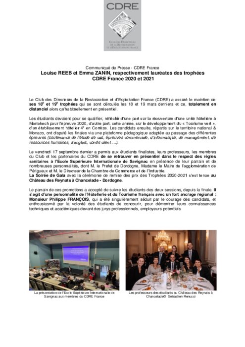 Métiers 22 septembre 2021 - 12:00 La Soirée de Gala avec la cérémonie de remise des prix des Trophées 2020-2021 s’est tenue au Château des Reynats à Chancelade - Dordogne. PDF (592 Ko) Télécharger