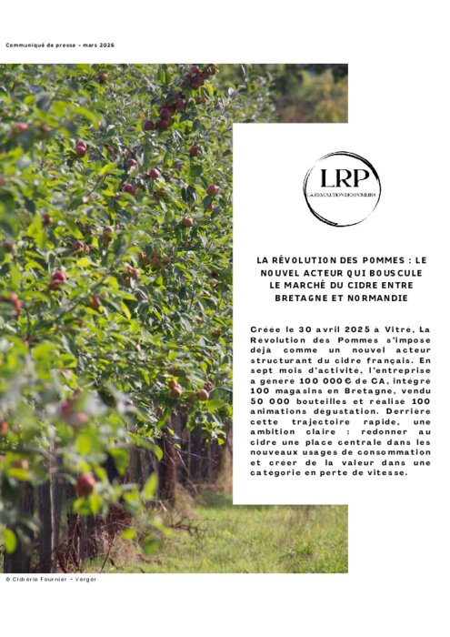 Créée le 30 avril 2025 à Vitré, La Révolution des Pommes s’impose déjà comme un nouvel acteur structurant du cidre français. En seulement sept mois d’activité, l’entreprise a réalisé 100 000 € de chiffre d’affaires, intégré 100 magasins en Bretagne, vendu 50 000 bouteilles et organisé 100 animations dégustation. Derrière cette croissance rapide, une ambition affirmée : redonner au cidre une place centrale dans les nouveaux usages de consommation et recréer de la valeur dans une catégorie en perte de vitesse.