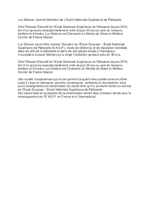 Chef Pâtissier Exécutif de l’Ecole Nationale Supérieure de Pâtisserie depuis 2019, fort d’un parcours exceptionnellement riche depuis 30 ans au sein de maisons étoilées et d’écoles, Luc Debove est Champion du Monde de Glace et Meilleur Ouvrier de France Glacier.