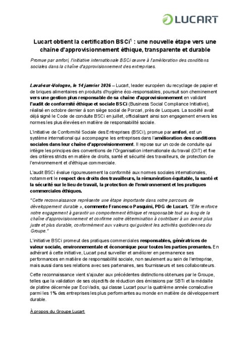 Lucart, leader européen du recyclage de papier et de briques alimentaires en produits d’hygiène éco-responsables, poursuit son cheminement vers une gestion plus responsable de sa chaîne d'approvisionnement en validant l'audit de conformité éthique et sociale BSCi (Business Social Compliance Initiative), réalisé en octobre dernier à son siège social de Porcari, près de Lucques. La société avait déjà signé le Code de conduite BSCi en juillet, officialisant ainsi son engagement envers les normes les plus élevées en matière de responsabilité sociale.
