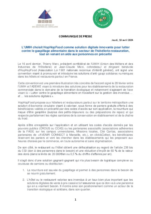 Le 16 avril , Thierry Marx, président confédéral de l’UMIH (Union des Métiers et des Industries de l'Hôtellerie) et Jean-Claude Mizzi, cofondateur et dirigeant bénévole d’HopHopFood (Association Loi 1901 nationale reconnue d’intérêt général), ont signé une convention visant à promouvoir et introduire les solutions d’anti-gaspi solidaires numériques dans les hôtels et restaurants partout en France.