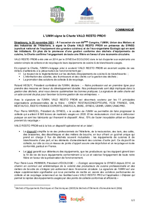 À l’occasion de son 69ème Congrès, l’UMIH, Union des Métiers et des Industries de l'Hôtellerie, a signé la Charte VALO RESTO PRO en présence du SYNEG (syndicat national de l’équipement des grandes cuisines) et de l’éco-organisme Ecologic qui en sont les initiateurs.