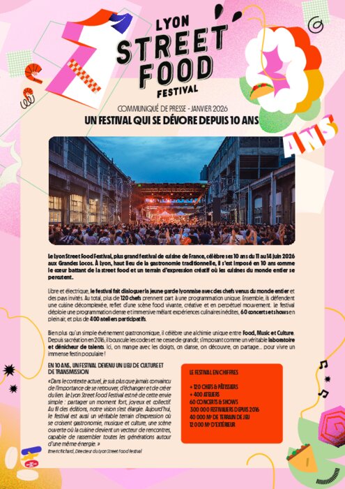 En 10 ans, le Lyon Street Food Festival s’est imposé comme le plus grand festival de cuisine de France et un véritable laboratoire de la food culture. En 2026, il célèbre ses 10 ans avec une édition anniversaire qui met la pâtisserie au centre de la scène, transformée en véritable spectacle vivant.