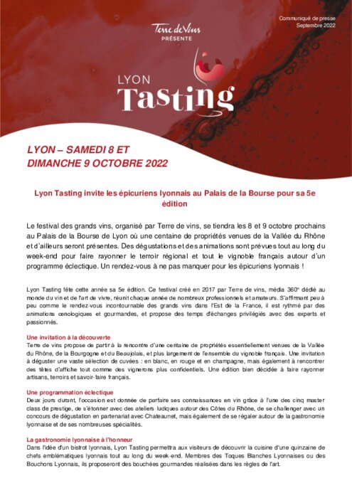 Le festival des grands vins, organisé par Terre de vins, se tiendra les 8 et 9 octobre prochains au Palais de la Bourse de Lyon où une centaine de propriétés venues de la Vallée du Rhône et d’ailleurs seront présentes.