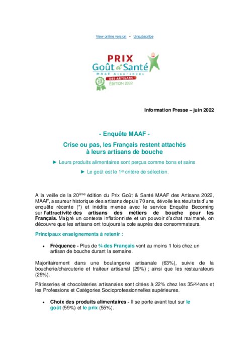 A la veille de la 20ème édition du Prix Goût & Santé MAAF des Artisans 2022, MAAF, assureur historique des artisans depuis 70 ans, dévoile les résultats d’une enquête récente et inédite menée avec le service Enquête Becoming sur l’attractivité des artisans des métiers de bouche pour les Français.