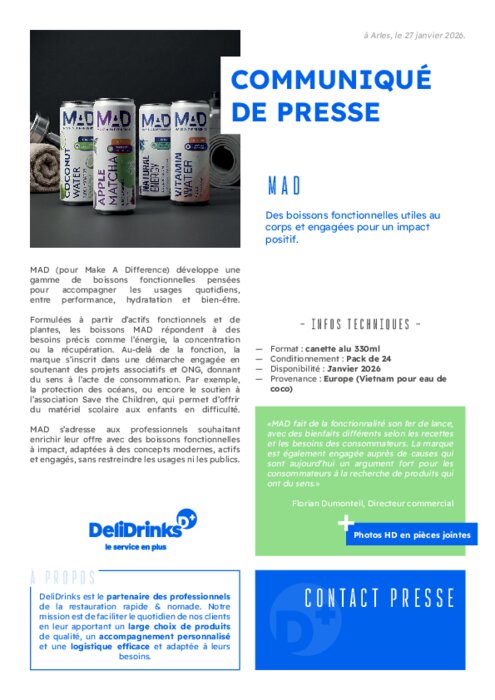 Mad (pour Make A Difference) développe une gamme de boissons fonctionnelles pensées pour accompagner les usages quotidiens, entre performance, hydratation et bien-être. Formulées à partir d’actifs fonctionnels et de plantes, les boissons Mad répondent à des besoins précis comme l’énergie, la concentration ou la récupération.