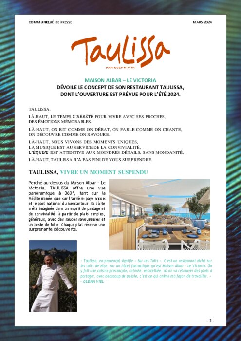 Perché au-dessus de l'hôtel Maison Albar - Le Victoria, Taulissa offre une vue panoramique à 360° tant sur la Méditerranée que sur l’arrière-pays niçois et le parc national du Mercantour. Sa carte a été imaginée dans un esprit de partage et de convivialité, à partir de plats simples, généreux, avec des sauces savoureuses et un zeste de folie. Chaque plat réserve une surprenante découverte.