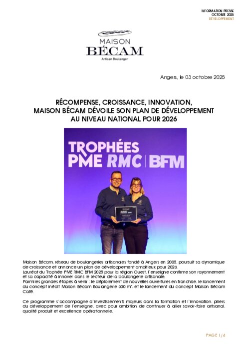 Maison Bécam, réseau de boulangeries artisanales fondé à Angers en 2005, poursuit sa dynamique de croissance et annonce un plan de développement ambitieux pour 2026. Lauréat du Trophée PME RMC BFM 2025 pour la région Ouest, l’enseigne confirme son rayonnement et sa capacité à innover dans le secteur de la boulangerie artisanale. Parmi les grandes étapes à venir : le déploiement de nouvelles ouvertures en franchise, le lancement du concept inédit Maison Bécam Boulangerie 600 m² , et le lancement du concept Maison Bécam Café.