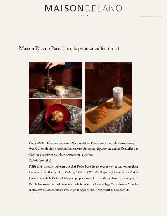Fidèle à ses origines italiennes, le chef Paolo Minelli s’est tourné vers la maison familiale Lavazza et la collection de cafés de Spécialité 1895 Coffee Designer by Lavazza, torréfiée à Turin au sein de la Factory 1895, pour proposer une offre de café en phase avec son époque. Pour le lancement, le chef a sélectionné de la collection l’assemblage Cocoa Reloaded que les clients retrouvent désormais aussi au petit-déjeuner et au restaurant, le Delano Café.