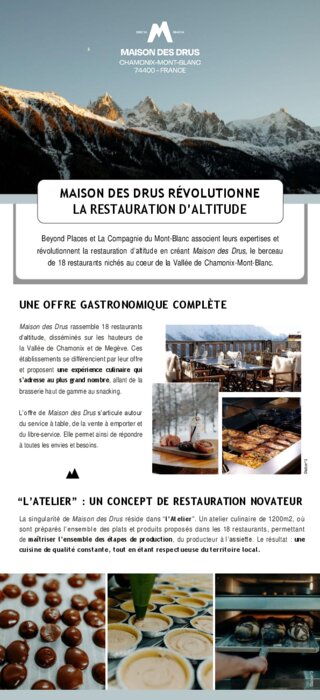 Beyond Places et La Compagnie du Mont-Blanc associent leurs expertises et révolutionnent la restauration d’altitude en créant Maison des Drus, le berceau de 18 restaurants nichés au cœur de la Vallée de Chamonix-Mont-Blanc. L’offre de Maison des Drus s’articule autour du service à table, de la vente à emporter et du libre-service. Elle permet ainsi de répondre à toutes les envies et besoins.