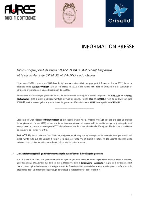 Ouverts en 1993 dans la région rouennaise à Quincampoix, puis à Rouen en février 2022, les deux établissements Maison VATELIER sont de véritables institutions en Normandie dans le domaine de la boulangerie-pâtisserie artisanale créative, de tradition et de qualité. En matière d’informatique point de vente, la direction de l’Enseigne a choisi l’expertise de CRISALID et d’AURES Technologies.