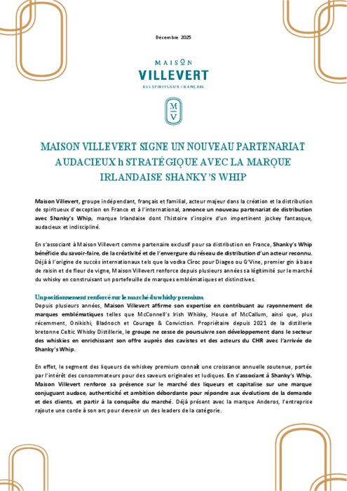 Maison Villevert, groupe indépendant, français et familial, acteur majeur dans la création et la distribution de spiritueux d’exception en France et à l’international, annonce un nouveau partenariat de distribution avec Shanky’s Whip, marque irlandaise dont l’histoire s’inspire d’un impertinent jockey fantasque, audacieux et indiscipliné.