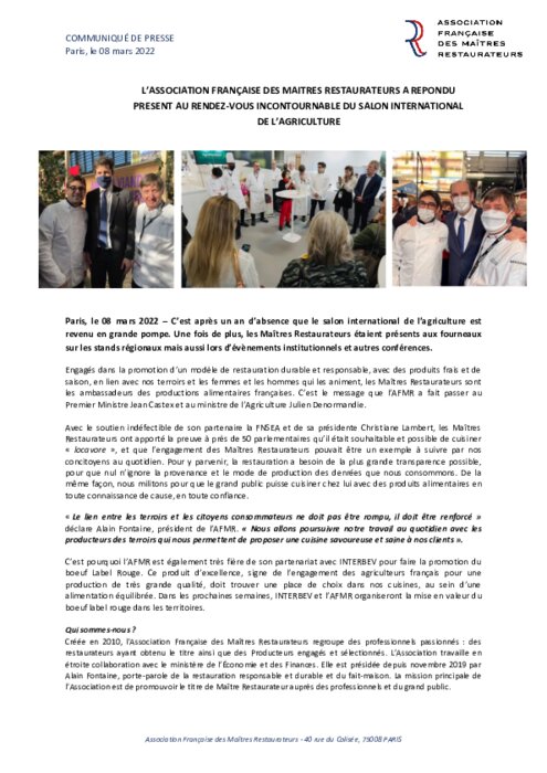 C’est après un an d’absence que le salon international de l’agriculture est revenu en grande pompe. Une fois de plus, les Maîtres Restaurateurs étaient présents aux fourneaux sur les stands régionaux mais aussi lors d’évènements institutionnels et autres conférences.