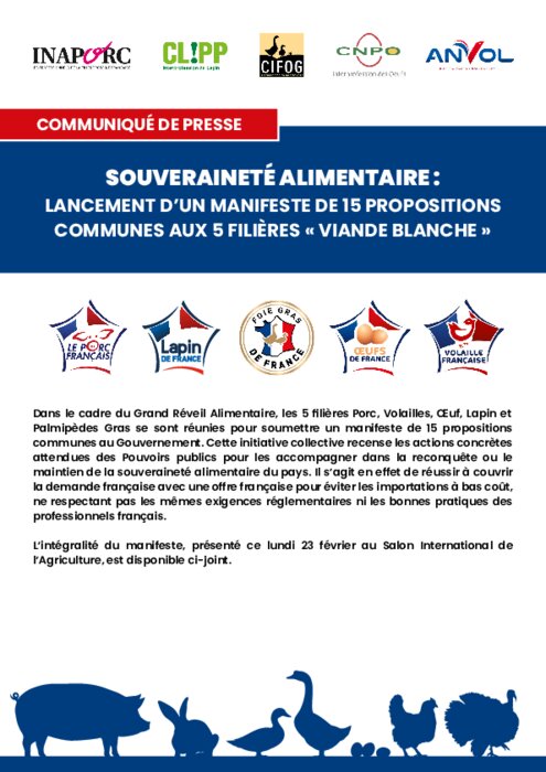 Dans le cadre du Grand Réveil Alimentaire, les 5 filières Porc, Volailles, Œuf, Lapin et Palmipèdes Gras se sont réunies pour soumettre un manifeste de 15 propositions communes au gouvernement. Cette initiative collective recense les actions concrètes attendues des pouvoirs publics pour les accompagner dans la reconquête ou le maintien de la souveraineté alimentaire du pays. Il s’agit en effet de réussir à couvrir la demande française avec une offre française pour éviter les importations à bas coût, ne respectant pas les mêmes exigences réglementaires ni les bonnes pratiques des professionnels français.