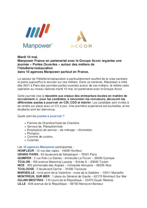 Manpower Jobdating hôtellerie : restauration à Paris