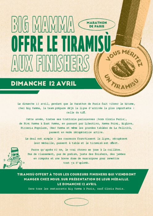 Le dimanche 12 avril, pendant que le Marathon de Paris fait vibrer le bitume, chez Big Mamma, la team prépare déjà la ligne d’arrivée la plus importante : celle du kiff. Cette année, toutes ses trattorie parisiennes (hors Gloria Paris), de Pink Mamma à East Mamma, en passant par Libertino, Mamma Primi, BigLove, Pizzeria Popolare, Ober Mamma et même les grandes tablées de La Felicità, passent en mode récupération active.