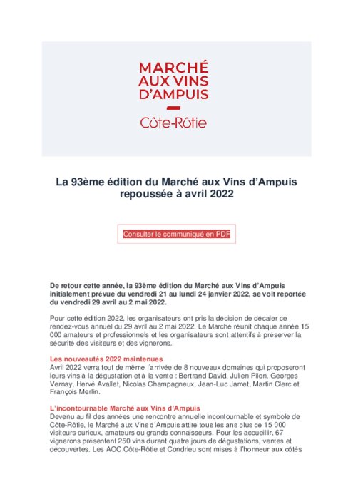 Métiers 06 janvier 2022 - 11:09 De retour cette année, la 93ème édition du Marché aux Vins d’Ampuis initialement prévue du vendredi 21 au lundi 24 janvier 2022, se voit reportée du vendredi 29 avril au 2 mai 2022. PDF (157 Ko) Télécharger