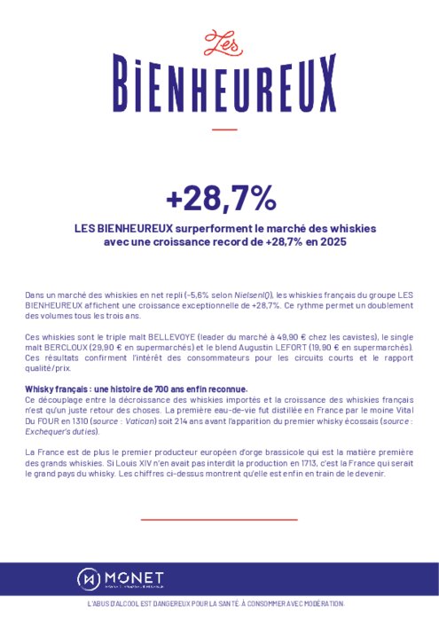 Dans un marché des whiskies en net repli (-5,6% selon NielsenIQ), les whiskies français du groupe Les Bienheureux affichent une croissance exceptionnelle de +28,7%. Ce rythme permet un doublement des volumes tous les trois ans. Ces whiskies sont le triple malt Bellevoye (leader du marché à 49,90 € chez les cavistes), le single malt Bercloux (29,90 € en supermarchés) et le blend Augustin Lefort (19,90 € en supermarchés). Ces résultats confirment l’intérêt des consommateurs pour les circuits courts et le rapport qualité/prix.