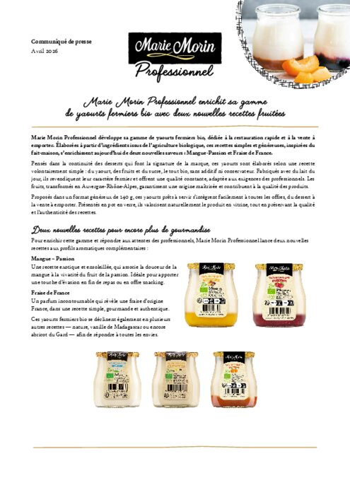 Marie Morin Professionnel développe sa gamme de yaourts fermiers bio, dédiée à la restauration rapide et à la vente à emporter. Élaborées à partir d’ingrédients issus de l’agriculture biologique, ces recettes simples et généreuses, inspirées du fait-maison, s’enrichissent aujourd’hui de deux nouvelles saveurs : Mangue-Passion et Fraise de France.