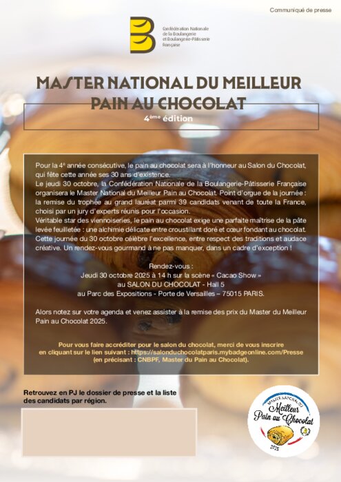 Pour la 4e année consécutive, le pain au chocolat sera à l’honneur au Salon du Chocolat, qui fête cette année ses 30 ans d’existence. Le jeudi 30 octobre, la Confédération Nationale de la Boulangerie-Pâtisserie Française organisera le Master National du Meilleur Pain au Chocolat. Point d’orgue de la journée : la remise du trophée au grand lauréat parmi 39 candidats venant de toute la France, choisi par un jury d’experts réunis pour l’occasion.