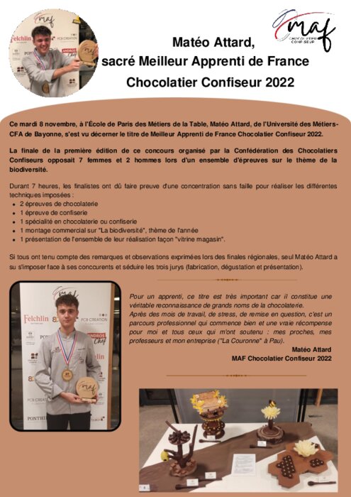 Métiers 09 novembre 2022 - 15:35 La finale de la première édition de ce concours organisé par la Confédération des Chocolatiers Confiseurs opposait 7 femmes et 2 hommes lors d'un ensemble d'épreuves sur le thème de la biodiversité. PDF (399 Ko) Télécharger