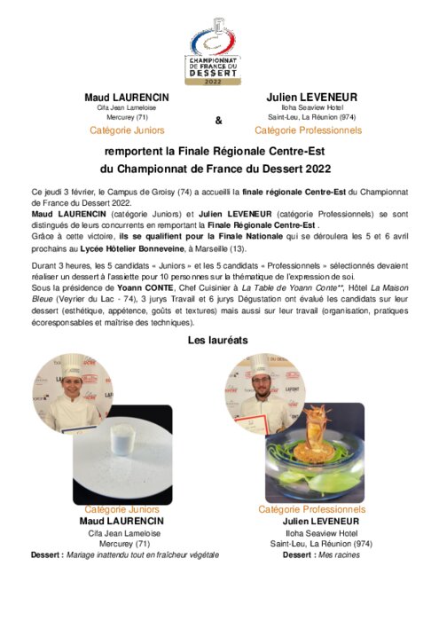Métiers 03 février 2022 - 19:35 Maud LAURENCIN (catégorie Juniors) et Julien LEVENEUR (catégorie Professionnels) se sont distingués de leurs concurrents en remportant la Finale Régionale Centre-Île-de-France. PDF (306 Ko) Télécharger