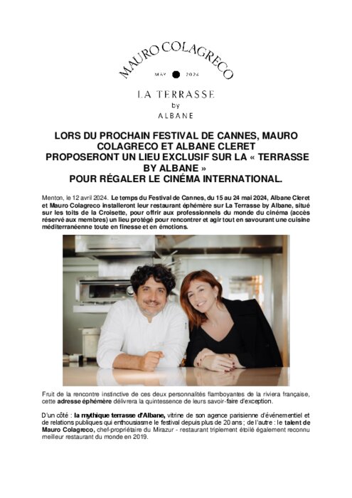 Le temps du Festival de Cannes, du 15 au 24 mai , Albane Cleret et Mauro Colagreco installeront leur restaurant éphémère sur La Terrasse by Albane, situé sur les toits de la Croisette, pour offrir aux professionnels du monde du cinéma (accès réservé aux membres) un lieu protégé pour rencontrer et agir tout en savourant une cuisine méditerranéenne toute en finesse et en émotions.