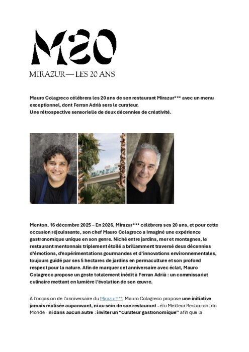 En 2026, Mirazur célèbrera ses 20 ans, et pour cette occasion réjouissante, son chef Mauro Colagreco a imaginé une expérience gastronomique unique en son genre. Niché entre jardins, mer et montagnes, le restaurant mentonnais triplement étoilé a brillamment traversé deux décennies d’émotions, d’expérimentations gourmandes et d’innovations environnementales, toujours guidé par ses 5 hectares de jardins en permaculture et son profond respect pour la nature. Afin de marquer cet anniversaire avec éclat, Mauro Colagreco propose un geste totalement inédit à Ferran Adrià : un commissariat culinaire mettant en lumière l’évolution de son œuvre.