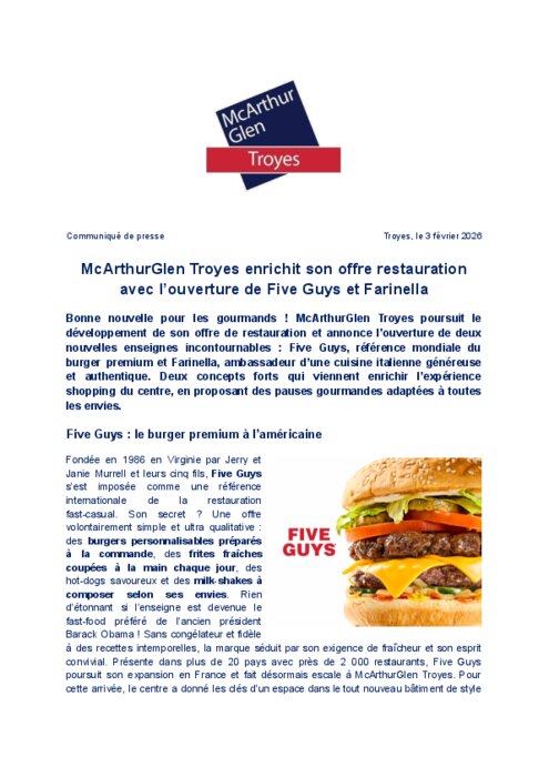 Bonne nouvelle pour les gourmands. McArthurGlen Troyes poursuit le développement de son offre de restauration et annonce l’ouverture de deux nouvelles enseignes incontournables : Five Guys, référence mondiale du burger premium et Farinella, ambassadeur d’une cuisine italienne généreuse et authentique. Deux concepts forts qui viennent enrichir l’expérience shopping du centre, en proposant des pauses gourmandes adaptées à toutes les envies.