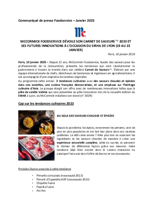 Fournisseurs 10 janvier 2023 - 14:13 Comme chaque année, McCormick Foodservice, leader des saveurs pour les professionnels de la restauration, présente les tendances culinaires qui révolutionneront la gastronomie à travers le monde dans son fameux Carnet de Saveurs. PDF (388 Ko) Télécharger