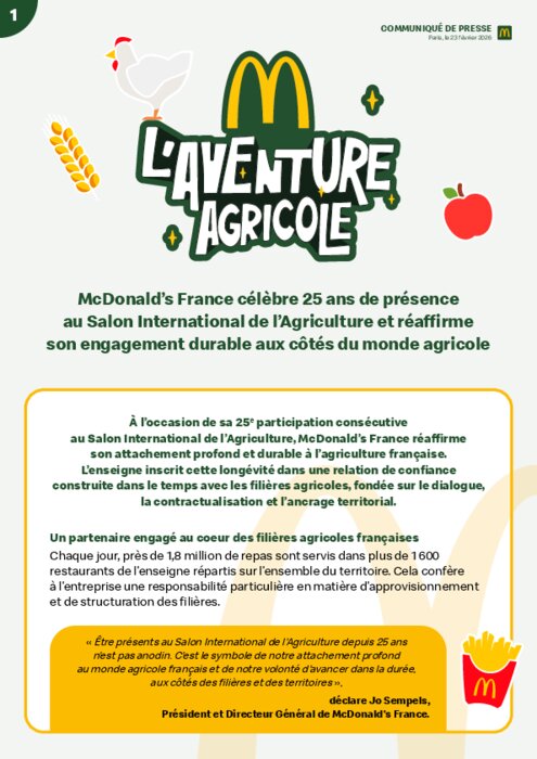 À l’occasion de sa 25e participation consécutive au Salon International de l’Agriculture, McDonald’s France réaffirme son attachement profond et durable à l’agriculture française. L’enseigne inscrit cette longévité dans une relation de confiance construite dans le temps avec les filières agricoles, fondée sur le dialogue, la contractualisation et l’ancrage territorial.
