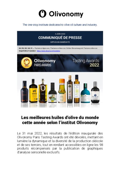 Les résultats de l’édition inaugurale des Olivonomy Paris Tasting Awards ont été dévoilés, mettant en lumière la dynamique et la diversité de la production oléicole et de ses terroirs, tout en rendant accessibles en ligne les 98 produits récompensés par la publication de graphiques d’analyse sensorielle exclusifs.