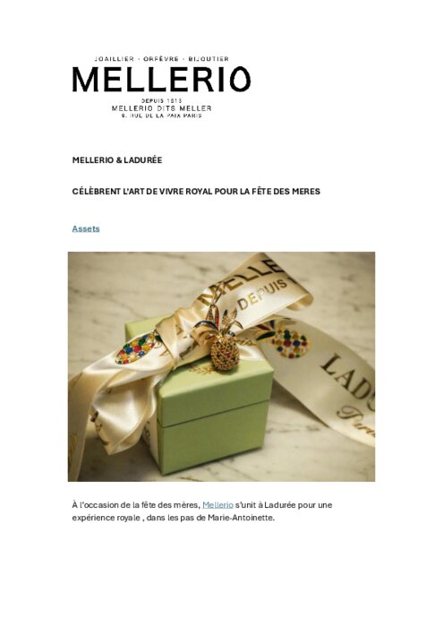 Le samedi 30 mai, Mellerio et Ladurée proposent une parenthèse d’exception, comme une invitation à revivre, le temps d’un après-midi, les rituels chers à Marie-Antoinette. Les participants débuteront par une visite privilégiée des archives Mellerio, au 9 rue de la Paix, où dessins anciens et pièces historiques témoignent de plus de quatre siècles de création. Le parcours se poursuivra chez Ladurée, rue Royale, autour d’un tea time inspiré de l’atmosphère des salons du XVIIIe siècle. Pensée comme une parenthèse élégante à l’approche de la Fête des Mères, cette expérience célèbre le plaisir de partager un moment précieux entre histoire, création et art de vivre à la française.