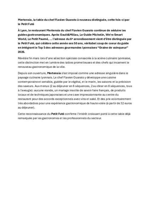 A Lyon, le restaurant Mertensia du chef Flavien Guarato continue de séduire les guides gastronomiques. Après Gault&Millau, Le Guide Michelin, We're Smart World, Le Petit Paumé, ... l’adresse du 6ᵉ arrondissement vient d’être distinguée par le Petit Futé, qui célèbre cette année ses 50 ans, véritabel coup de coeur du guide en intégrant le Top 5 des adresses gourmandes lyonnaises “Graine de vainqueur” 2026.