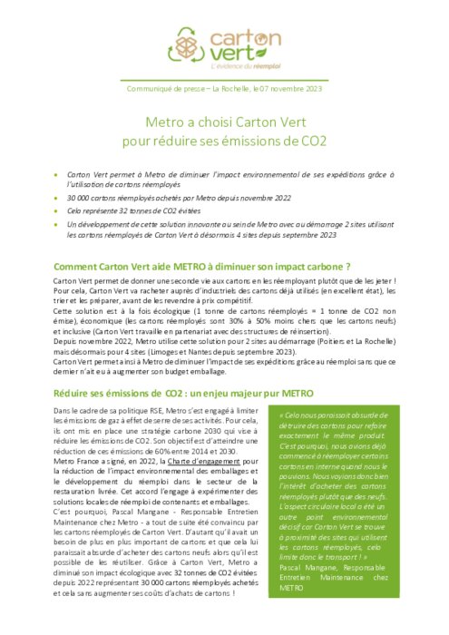 Distributeurs 07 novembre 2023 - 15:43 Carton Vert permet à Metro de diminuer l’impact environnemental de ses expéditions grâce à l’utilisation de cartons réemployés. PDF (179 Ko) Télécharger
