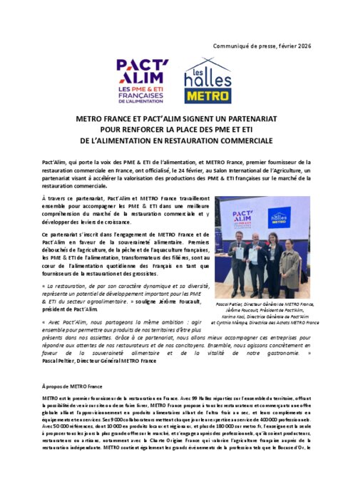Pact’Alim, qui porte la voix des PME & ETI de l’alimentation, et Metro France, premier fournisseur de la restauration commerciale en France, ont officialisé, le 24 février, au Salon International de l’Agriculture, un partenariat visant à accélérer la valorisation des productions des PME & ETI françaises sur le marché de la restauration commerciale.
