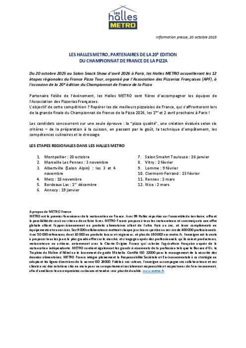 Partenaire fidèle de l’événement, les Halles Metro sont fières d’accompagner les équipes de l’Association des Pizzerias Françaises. L’objectif de cette compétition ? Repérer les dix meilleurs pizzaiolos de France, qui s’affronteront lors de la grande finale du Championnat de France de la Pizza 2026, les 1ᵉʳ et 2 avril prochains à Paris .
