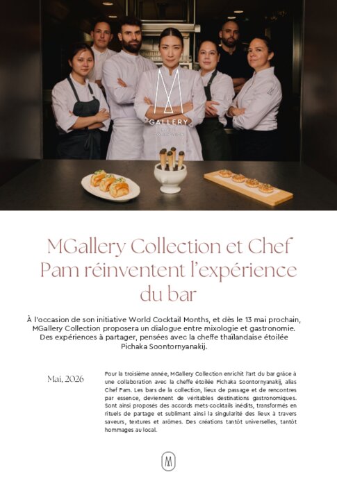 Pour la troisième année, MGallery Collection enrichit l’art du bar grâce à une collaboration avec la cheffe étoilée Pichaka Soontornyanakij, alias Chef Pam. Les bars de la collection, lieux de passage et de rencontres par essence, deviennent de véritables destinations gastronomiques. Sont ainsi proposés des accords mets-cocktails inédits, transformés en rituels de partage et sublimant ainsi la singularité des lieux à travers saveurs, textures et arômes. Des créations tantôt universelles, tantôt hommages au local.