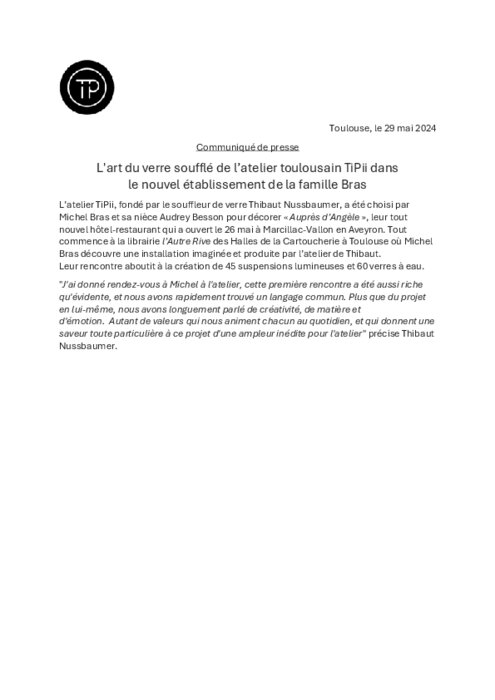 L’atelier TiPii, fondé par le souffleur de verre Thibaut Nussbaumer, a été choisi par Michel Bras et sa nièce Audrey Besson pour décorer « Auprès d’Angèle », leur tout nouvel hôtel-restaurant qui a ouvert le 26 mai à Marcillac-Vallon en Aveyron. Tout commence à la librairie l’Autre Rive des Halles de la Cartoucherie à Toulouse où Michel Bras découvre une installation imaginée et produite par l’atelier de Thibaut. Leur rencontre aboutit à la création de 45 suspensions lumineuses et 60 verres à eau.