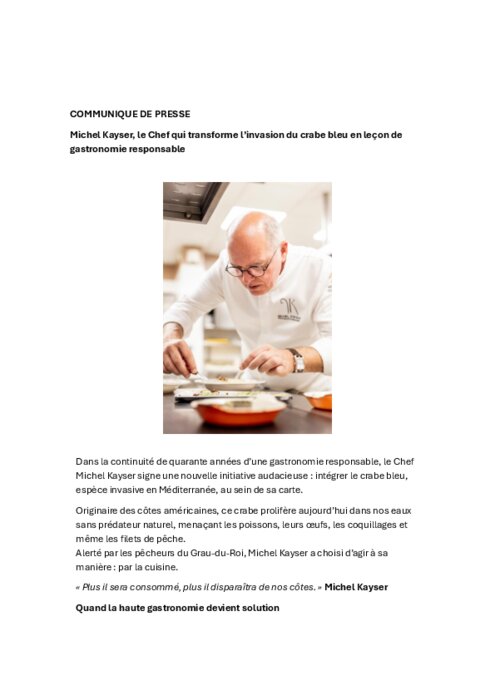 Restauration commerciale 30 octobre 2025 - 10:51 Dans la continuité de quarante années d’une gastronomie responsable, le chef Michel Kayser signe une nouvelle initiative audacieuse : intégrer le crabe bleu, espèce invasive en Méditerranée, au sein de sa carte. PDF (208 Ko) Télécharger credit Kayser