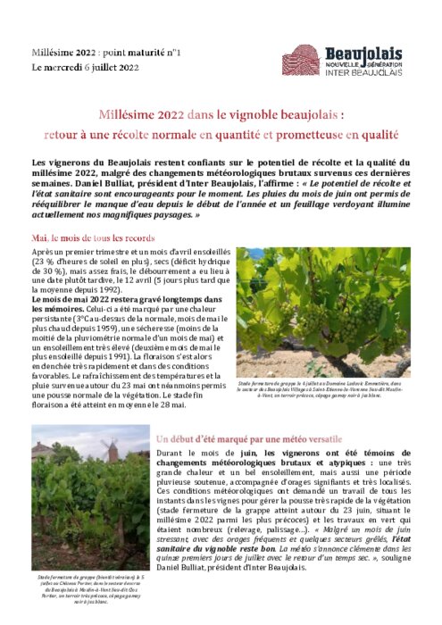 Les vignerons du Beaujolais restent confiants sur le potentiel de récolte et la qualité du millésime 2022, malgré des changements météorologiques brutaux survenus ces dernières semaines.