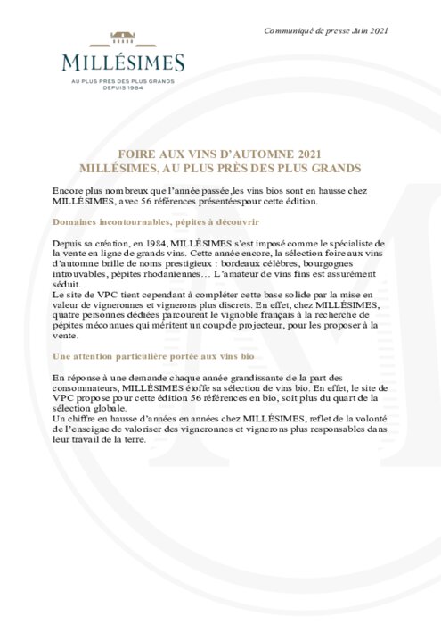 La Foire aux Vins d’automne 2021 concoctée par Millésimes, expert de la vente en ligne de grands vins, se tiendra du mardi 14 septembre au mardi 5 octobre 2021. Cette année, 200 références ont été sélectionnées par le site de VPC : une base solide de grands noms du vin, fièrement accompagnée de quelques pépites plus méconnues.